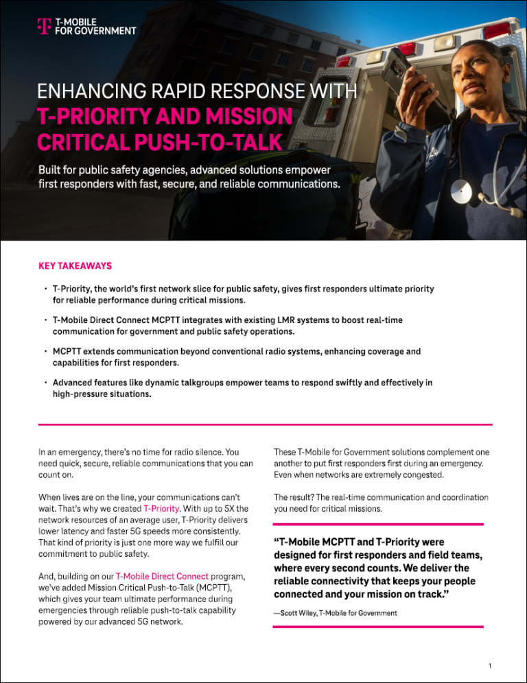 In an emergency, there’s no time for radio silence. You need quick, secure, reliable communications. T-Mobile Mission Critical Push-to-Talk solutions were designed to meet the needs of first responders. Along with T-Priority, the world’s first 5G network slice for public safety, you get lower latency and faster 5G speeds more consistently.