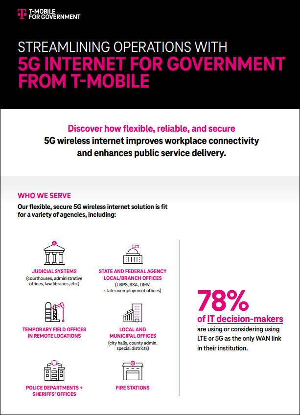 In an era where digital efficiency underpins governmental success, T-Mobile’s 5G Internet for Government emerges as a game-changer. This whitepaper unveils a robust fixed wireless solution engineered to meet the distinct connectivity demands of federal and local entities, including schools and law enforcement. With a focus on comprehensive coverage, swift deployment, and advanced security features, this solution is designed to fuel digital transformation across government sectors effortlessly.